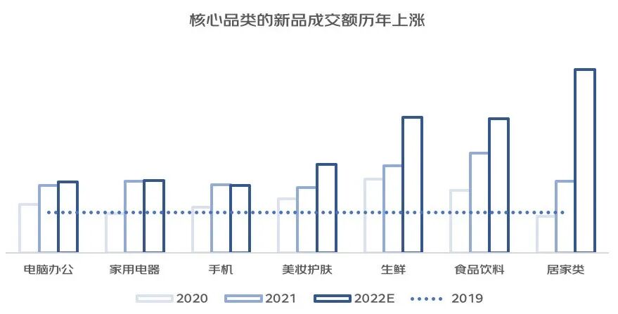 新品一直以来是拉动整体消费的重要动力。其成交额增长一直领先于所属品类的整体增幅。
