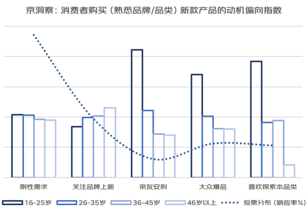 而在“喜欢探索该品类”和“亲友安利”、“大众爆品”等选项中,年轻人的偏好度显著领先,这突出其主观上更倾向个性化爱好,同时易被社交圈子影响的特征。