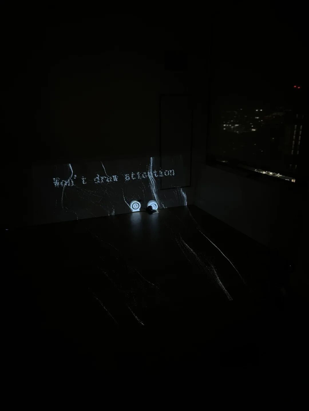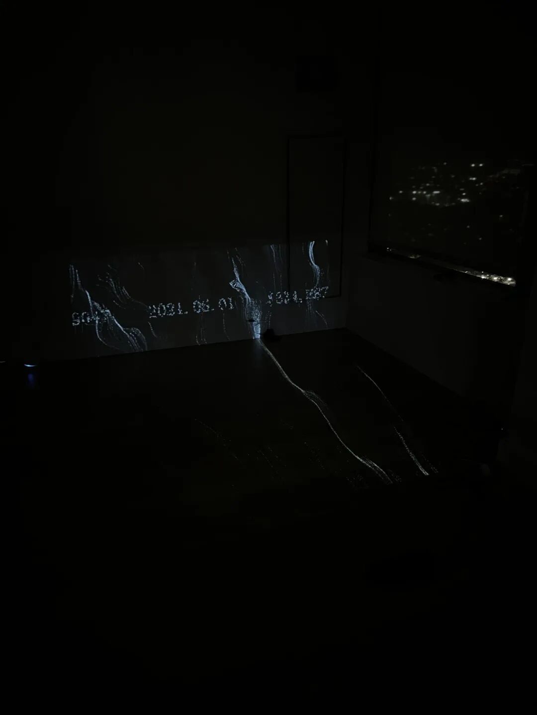 当观众进入暗室时,通过投影仪,一半的视觉关注将被投射到墙上,另一半则会投射到地面上。超声波传感器和Arduino会开始通过使用特定频率的声波测量观众的距离,并根据距离在地面上显示时间和数据。