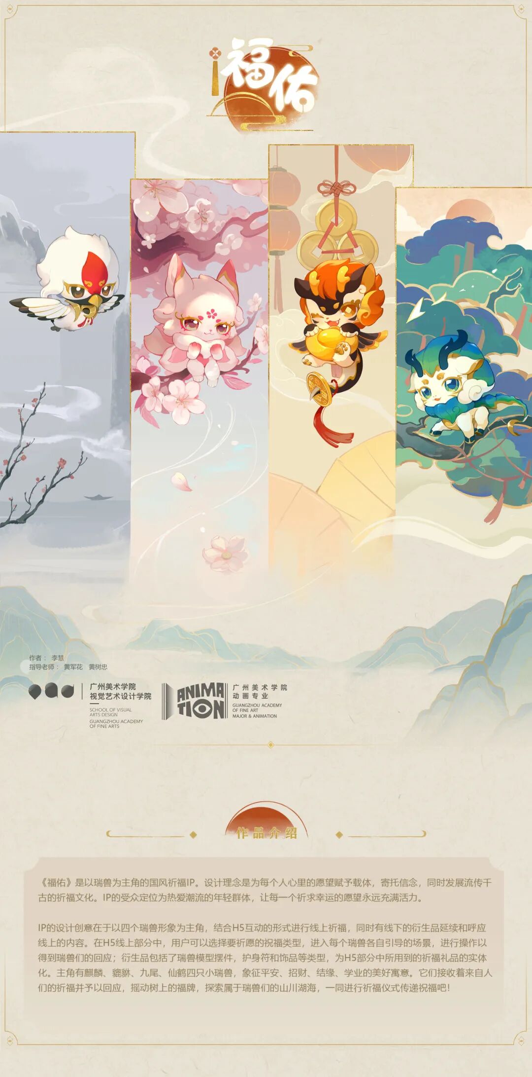 作品简介:《福佑》是以瑞兽为主角的国风祈福IP。主题为流传至今的祈福文化,设计理念是为每个人心里的愿望赋予载体,寄托信念。受众定位为热爱潮流的年轻群体,让每一个祈求幸运的愿望永远充满活力。