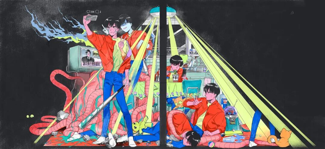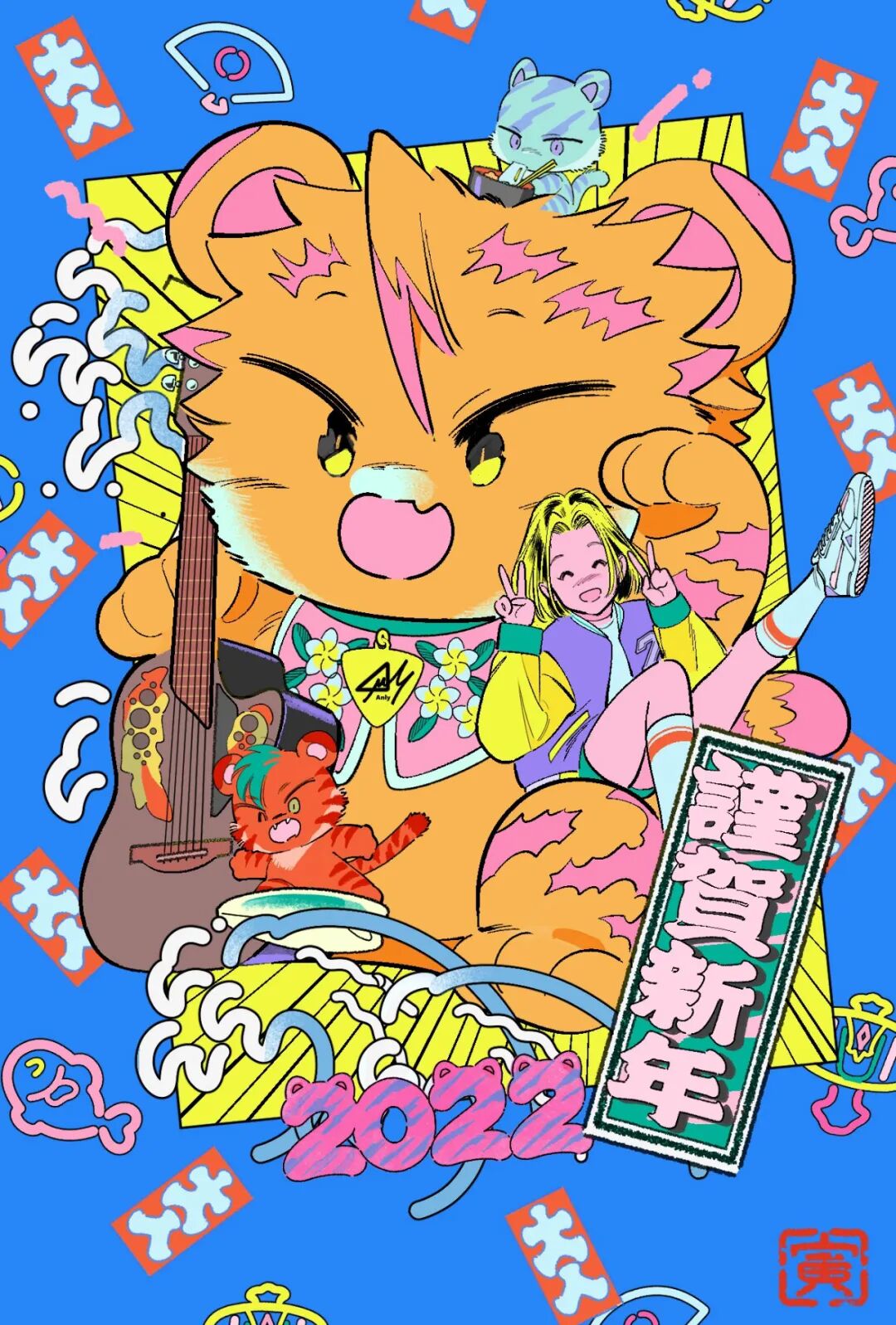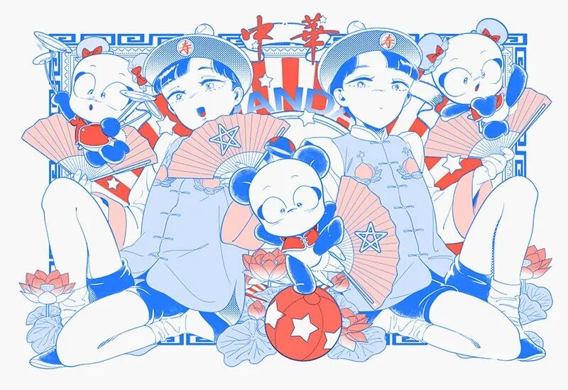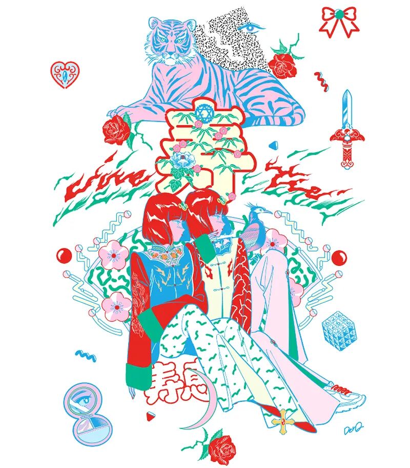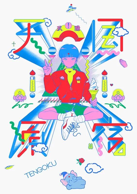 此外,在 DenQ 的作品中还能感受到的一点是极为考究的构图以及文字尤其是汉字的穿插,让人感叹这绝不仅仅是一副插画作品,更是一副完美的平面设计作品,极富冲击力和感染力的设计作品,并且拥有广泛的应用场景和受众人群。