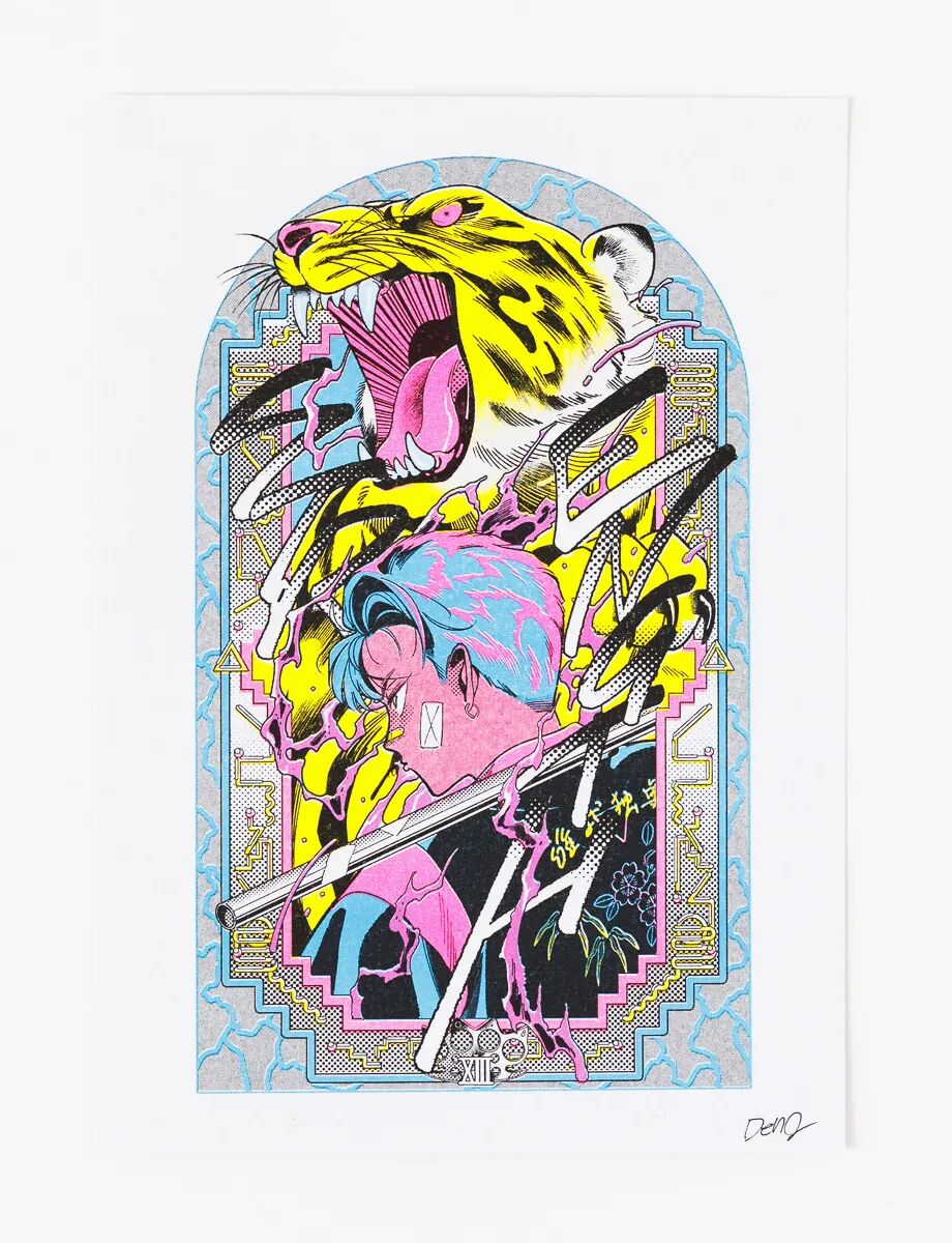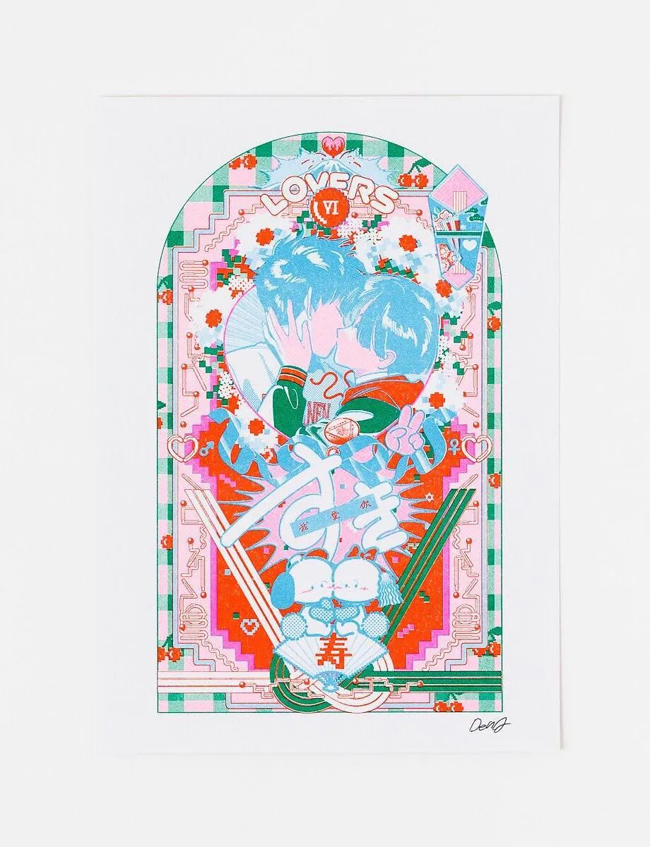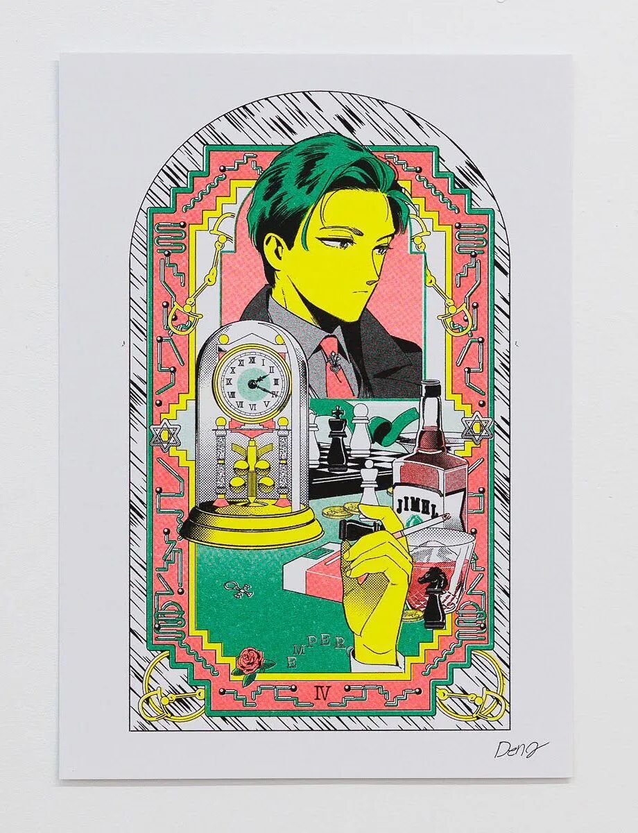 此外,在 DenQ 的作品中还能感受到的一点是极为考究的构图以及文字尤其是汉字的穿插,让人感叹这绝不仅仅是一副插画作品,更是一副完美的平面设计作品,极富冲击力和感染力的设计作品,并且拥有广泛的应用场景和受众人群。