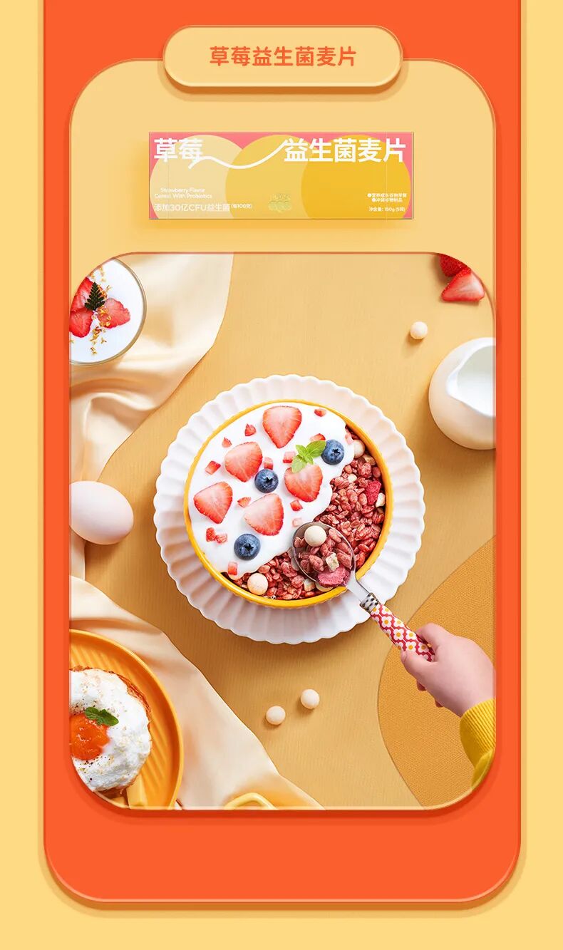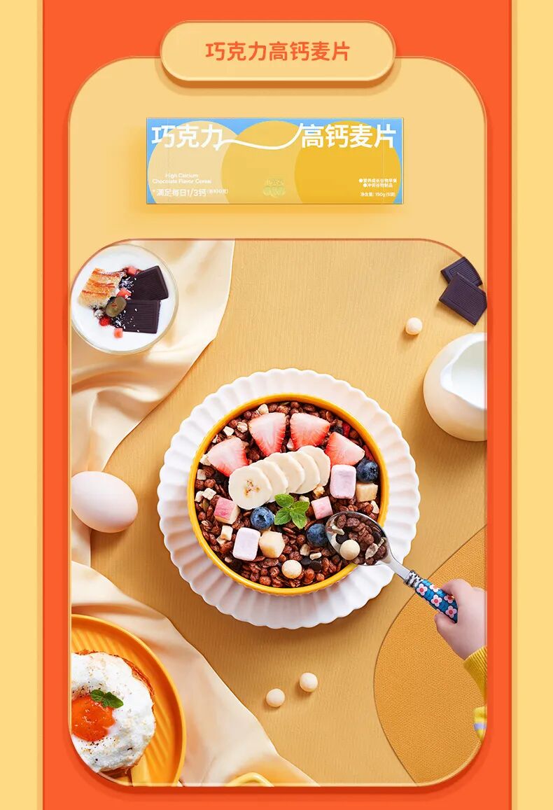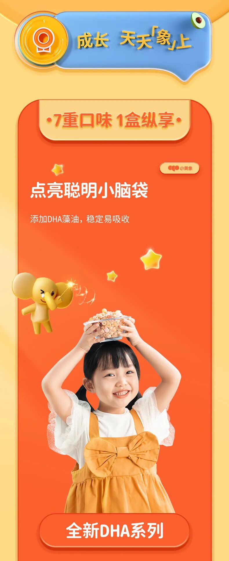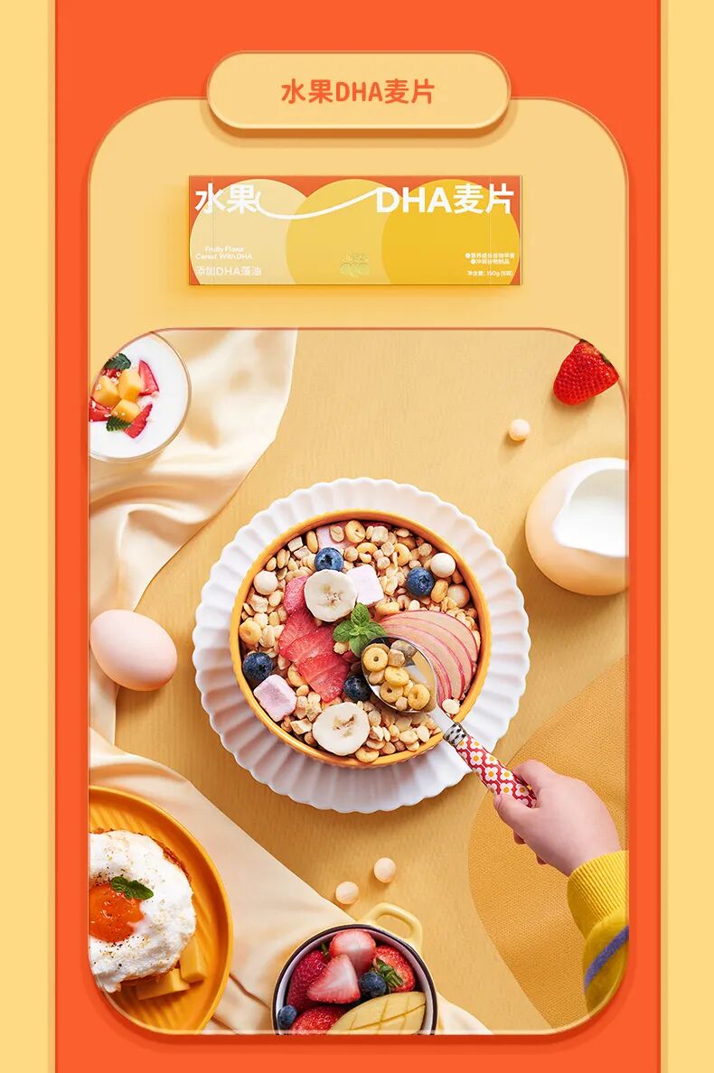 这款儿童早餐,也是C4D制作,详情页融入了店铺的IP小黄象,颜色搭配也比较柔和,属于橙色和黄色的同色系搭配,偶尔也有蓝色做点缀,非常漂亮。
