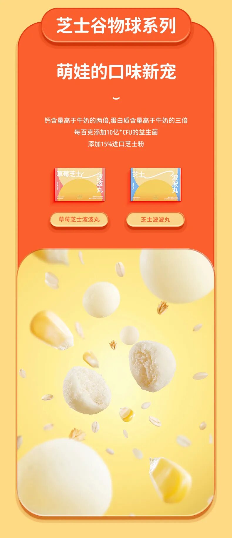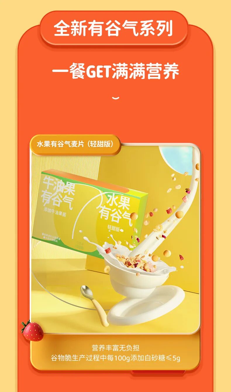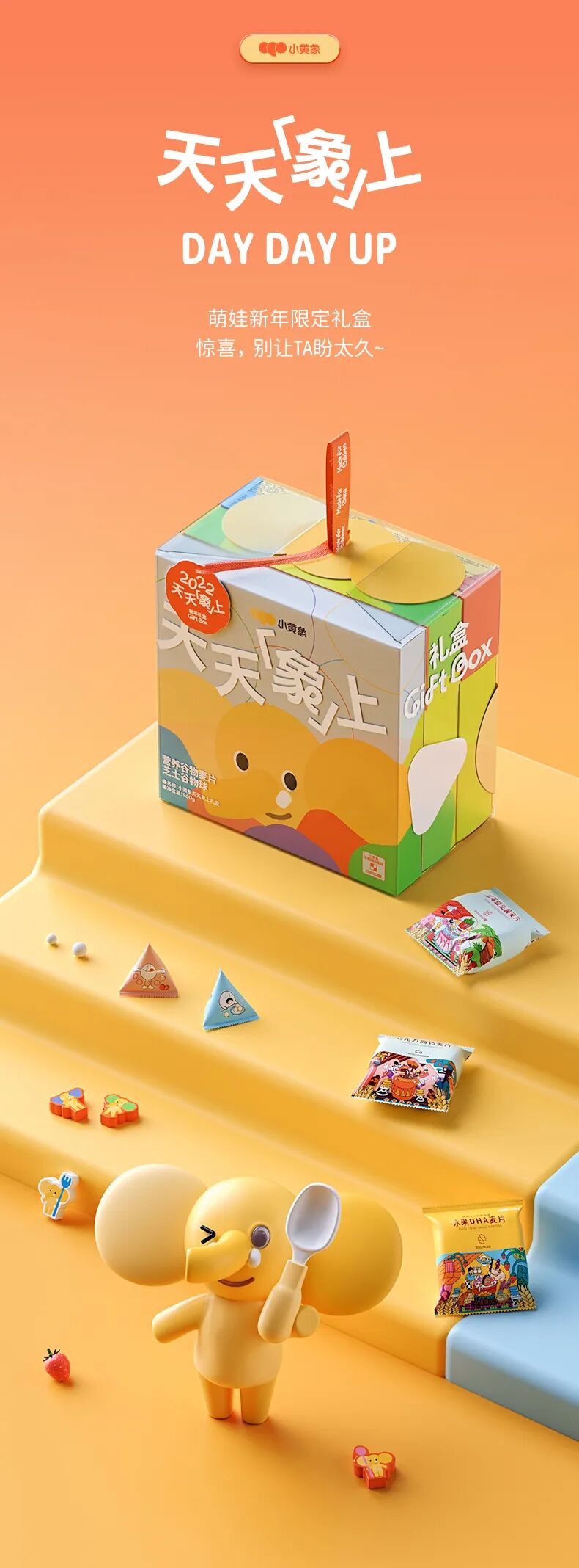 这款儿童早餐,也是C4D制作,详情页融入了店铺的IP小黄象,颜色搭配也比较柔和,属于橙色和黄色的同色系搭配,偶尔也有蓝色做点缀,非常漂亮。