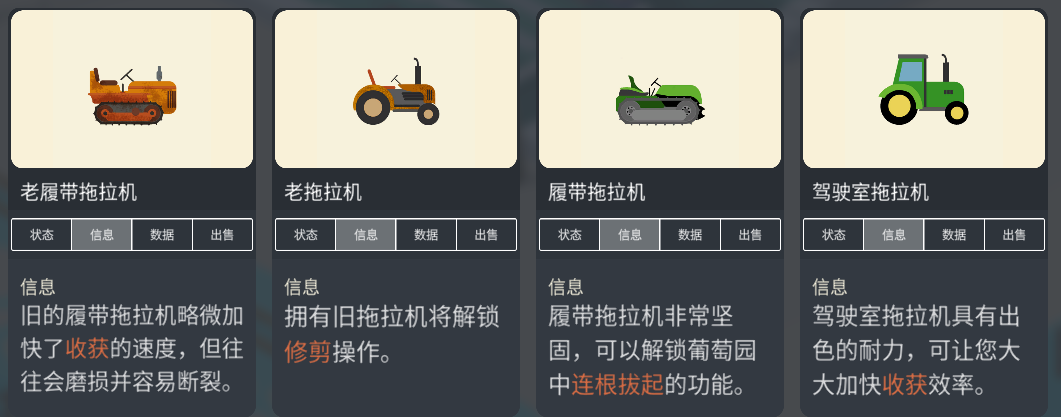 「工具屋」对应种植,包含拖拉机、气象办公室等内容,用以提升种植效率、护理葡萄园;