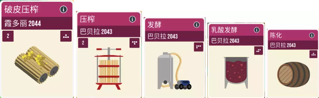 例如最初的酿造工艺中是没有乳酸发酵与陈化步骤的,只有消耗资源点开科技树,才能为葡萄园等级带来这两项工艺,控制葡萄酒的酸度与酒体;