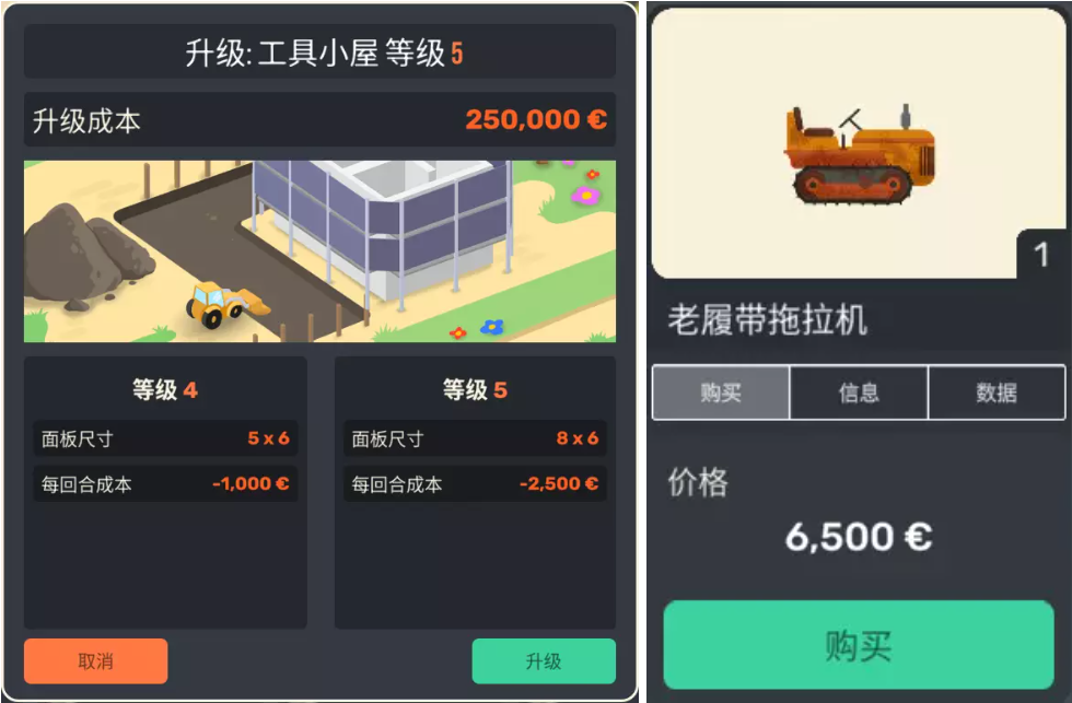 「地板升级」最好理解,它对应着庄园中央的方格,只要资源足够,就可以升级扩大方格面积,塞下更多事件。