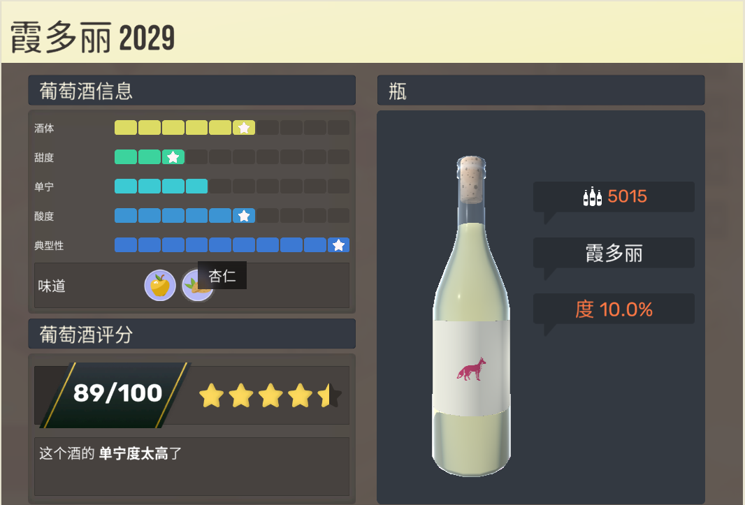 刚开始,每一种葡萄酒的4个维度是隐藏的,玩家只能跟着感觉地去调整酿造流程。直到葡萄酒装瓶封装到品酒会上,品酒师们才会给出4个维度的评判,指出它们距离这一种类葡萄酒最出色的品质还有多远——玩家只能这样一次次摸索酿造,才能找到葡萄酒的最佳酿造流程。