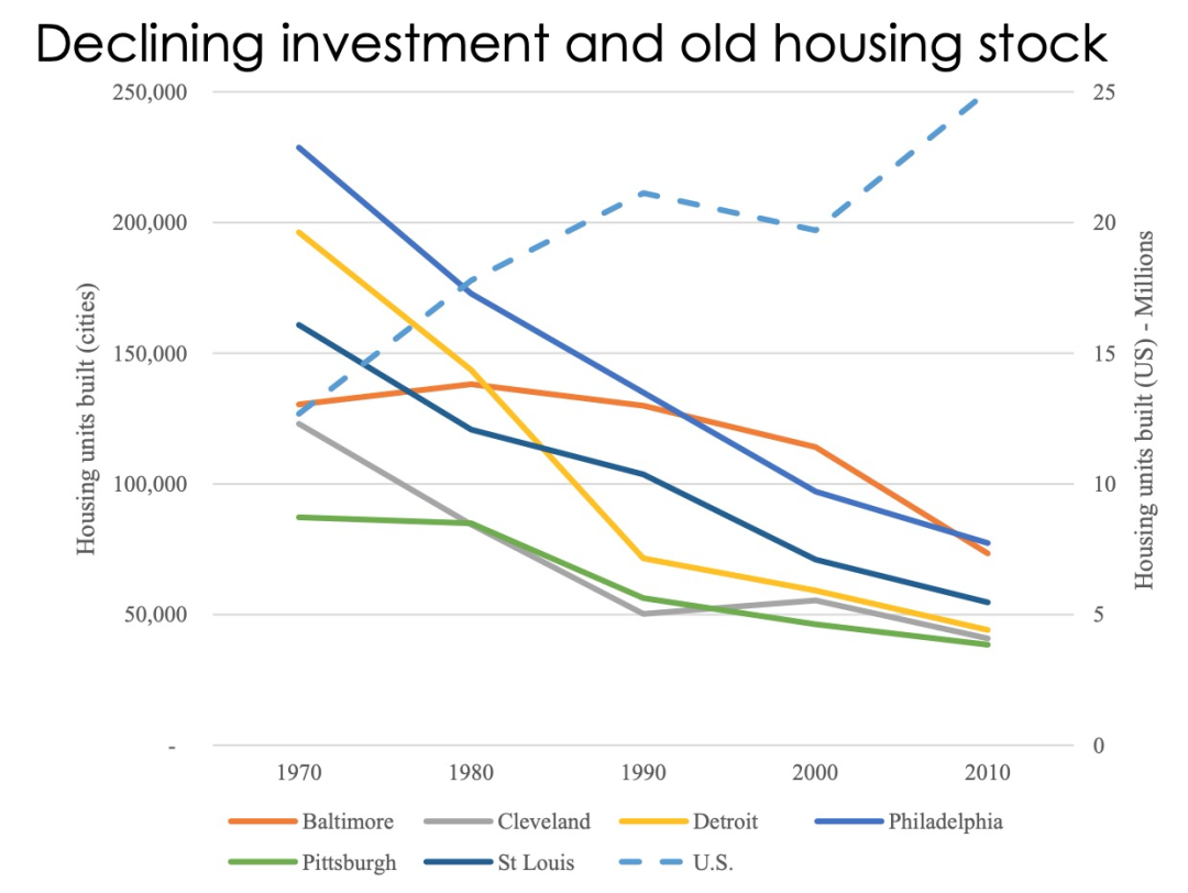 两位作者把焦点放在美国的六个老工业城市上——巴尔的摩、克利夫兰、底特律、费城、匹兹堡和圣路易斯——这些城市从 1970 年至今一直在苦苦挣扎。