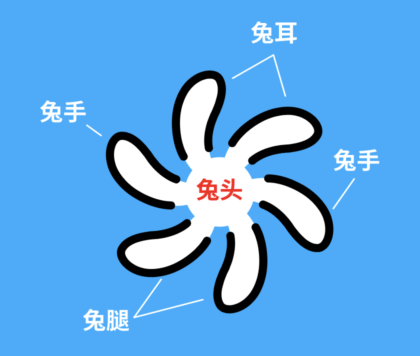 为什么要复制5个呢?原因很简单,就是我发现除了兔耳,其他的扇叶还能构成兔子的四肢,而中间的圆自然就是兔头了,如下: