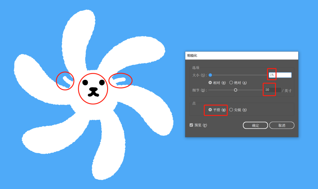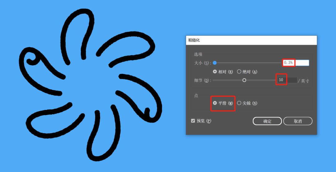 ①选中所有描边部分,执行对象-路径-轮廓化描边,然后执行效果-扭曲和变换-粗糙化命令。效果和数值如下,仅供参考。