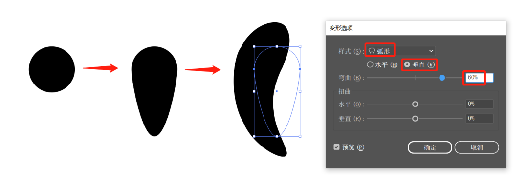 这一步很简单,只需要先画一个圆,然后把圆的底部锚点向下拖动,然后在效果-变形中加个弧形即可。