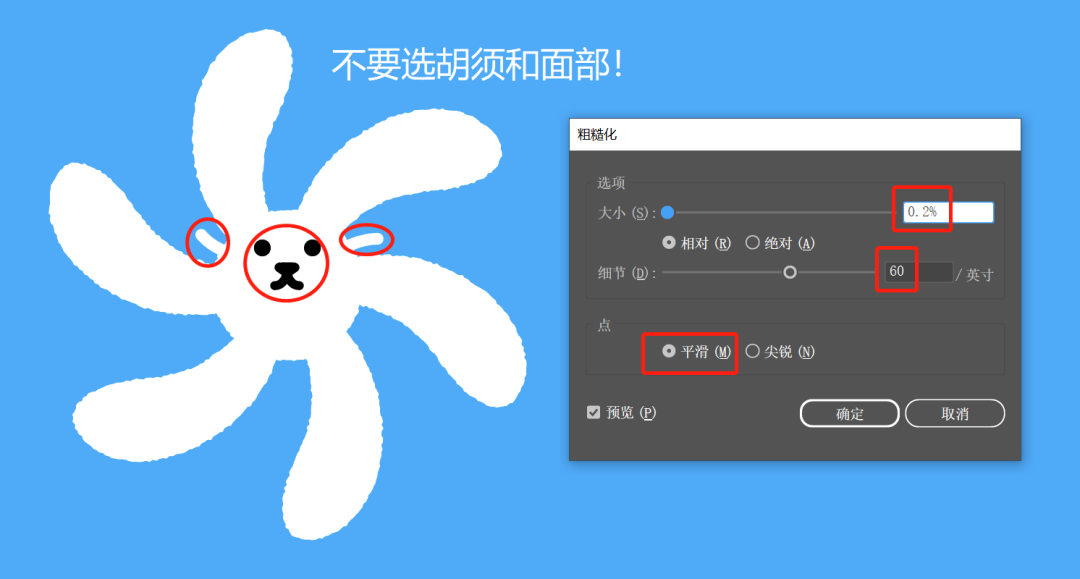 ②同理,将兔子身体合并,也执行一次粗糙化。注意!不要选胡须和面部,如下: