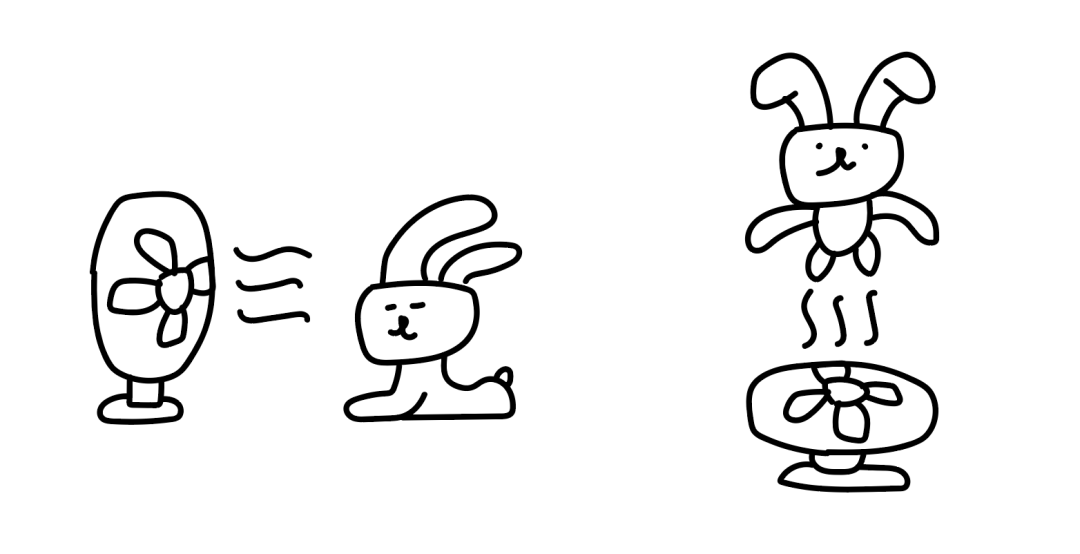 要将兔子和风扇联系起来其实不难,一开始我想到的画面就是兔子吹风扇,如果想让画面有趣点儿,可以搞个风扇吹兔子,看下我的灵魂草图。