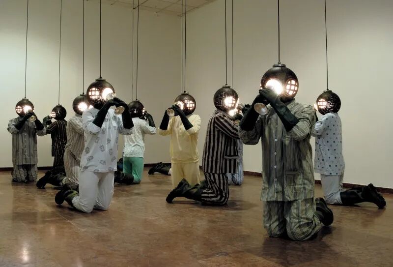 暗黑总是和荒诞相联系。荒诞是当代艺术的另一个特征,匈牙利艺术家巴拉兹·科斯尼(Balazs Kicsiny,1958— )便是一种荒诞的能量体。用铁链紧裹头部,用皮鞋、潜水头盔和体育比赛防护头盔代替头部,用种种物体代替了容纳人类思想的头脑。跪在和趴在地上的人,便成为一具具行尸走肉。