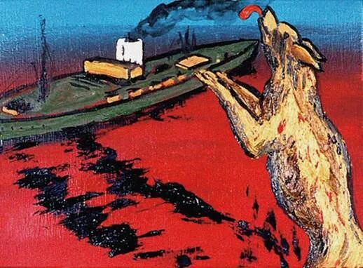 维尔纳·比特内尔的批判、挑衅和禁忌性绘画,像一个年轻的野蛮人在肆无忌惮地破坏一切。但是他的粗野是相当有修养的,那熟练有力的笔触,显示出自信和掌控的能力,粗糙的肌理显示出新表现主义的特有力量。绘画里的形象充满了隐喻:戴着红色乳罩作为眼罩的马头,站立在铁道边的金属猫头鹰,矗立在蓝色月夜风景中的大西服……无数的形象以符号化的造型出现。所以他的画看似野蛮,其实也还不算是坏画。