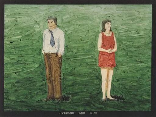 美国画家奈尔·詹尼(Neil Jenney,1945— )的《坏年代》(The Bad Years, 1969—1970),以粗陋的笔法和简单的色彩画出两个站着的男女,表情相当不快,也不存在什么造型。就这样,詹尼画了一系列的这样两个人站在好像草地的绿颜色上,笔触和颜色都不做更多的解释,既不写实,也不愉悦,简单而又粗暴。偶然有棕色和蓝色底子,好像就不会画除了绿底子之外的其他颜色。