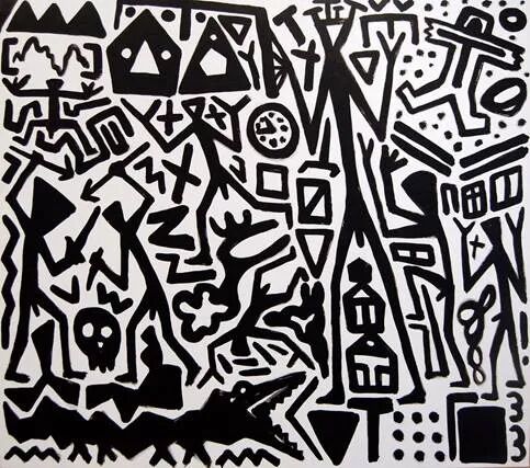 在当代环境中回味洞穴文化以及古埃及、玛雅人和非洲土著的原生态艺术,也有一种基于本能的共鸣,这样的直率有着区域和历史的原因。以粗野和涂鸦对抗艺术,做高雅艺术的叛徒,彭克的勇气可嘉。我自己搞黑白版画,因此习惯于接受彭克那黑白分明的绘画。