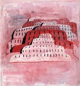 库奇不喜欢正儿八经地把画摆在画架上画,而是直接钉在墙上,或者要么在野外,要么被人们围着,这两个相反的状态都让他莫名激动,进入到一种激情表现的情境里。所以库奇和新表现主义的粗野不是一回事,德国新表现主义的粗野有文化有气质,而库奇的表现直觉简单富于激情,与德国新表现主义的历史宏大相比,库奇则着眼于生活日常的趣味。艺术家的生活环境常常构成艺术家的视觉经验,并通过艺术呈现出来。库奇主要生活在安科纳港口附近,那里的大海、陆地像著名的风景画一样,构成库奇大部分作品中风景画面的创作原型。有一年,我曾经乘坐游轮经过这个港口,当然,风景比库奇的绘画优美多了。
