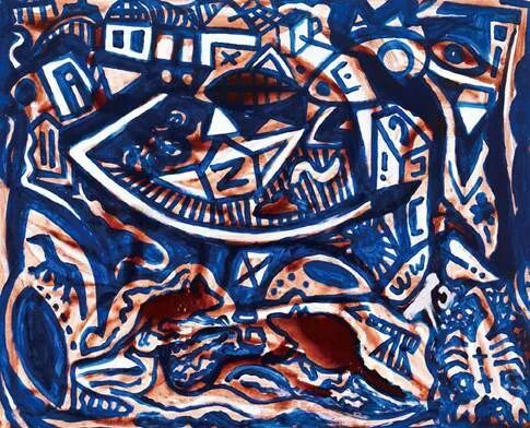 大胡子的A·R·彭克(A· R· Penck,1939—2017)也是如此 :各种符号布满画面,或黑白,或彩色,也是粗野而原始的。彭克钟情于从原始艺术的图像符号中汲取营养,或许是因为他认为原始的符号情感和当代相类似。因此这种汲取和转换有效地在彭克的绘画中表现出来,也的确让这类表意符号、象形符号有了新的视觉意义。