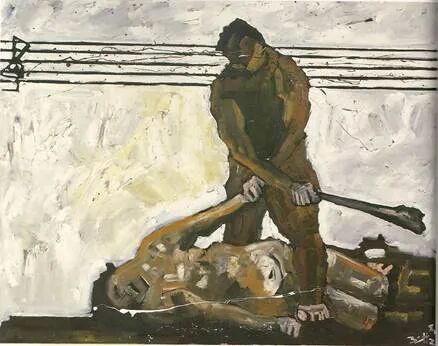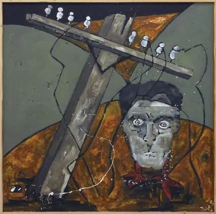 我最喜欢他这个时期的作品,有相当强烈的讽刺和对立情绪,画面也有批判性的社会政治议题,如早期的戴着3k党面具的形象。无疑,古斯顿拥有对绘画真诚坚定的立场。做一件坏事容易,难的是一辈子做坏事。“坏画”应该由“坏人”来画,而且是如此真诚和坚持,表现荒诞便是自然而然的了,否则艺术还可以干什么?