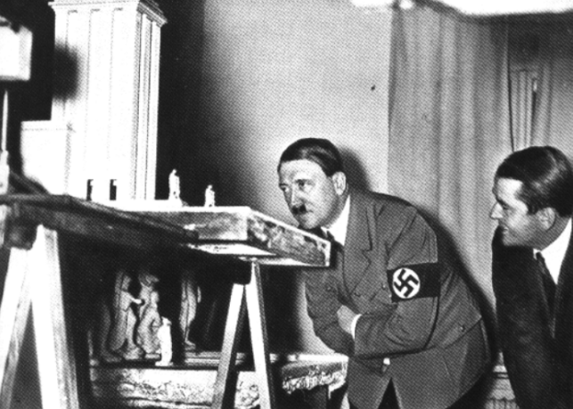 ▲1937年,希特勒正在打量世博会德国馆的方案 图源:网络