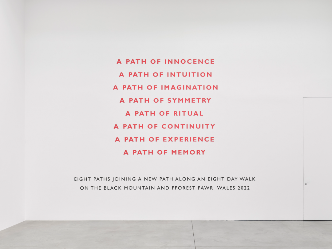 文本一直是理查德·朗艺术创作的重要元素之一。本次展出的五件文本作品中最早的一件是来自1987年的《Desert Flowers》,最新的一件则是今年创作的《A Path of Innocence》。这些作品突出艺术家与各种景观亲身互动的专注和投入,不仅描绘了大自然的细节,如发源于英格兰德文郡达特姆尔高原(Dartmoor)的14条河流、薰衣草的气味,抑或在约书亚树国家公园里疾风的呼啸和土狼的嚎叫,它们还象征着对每一次行走所用时间的丈量。