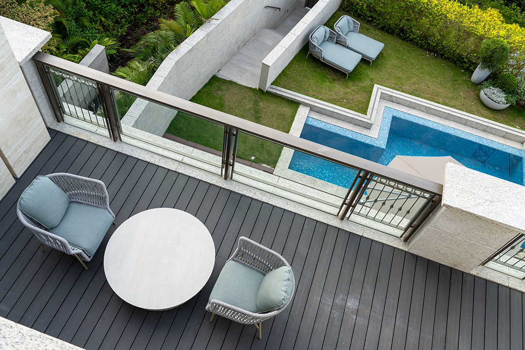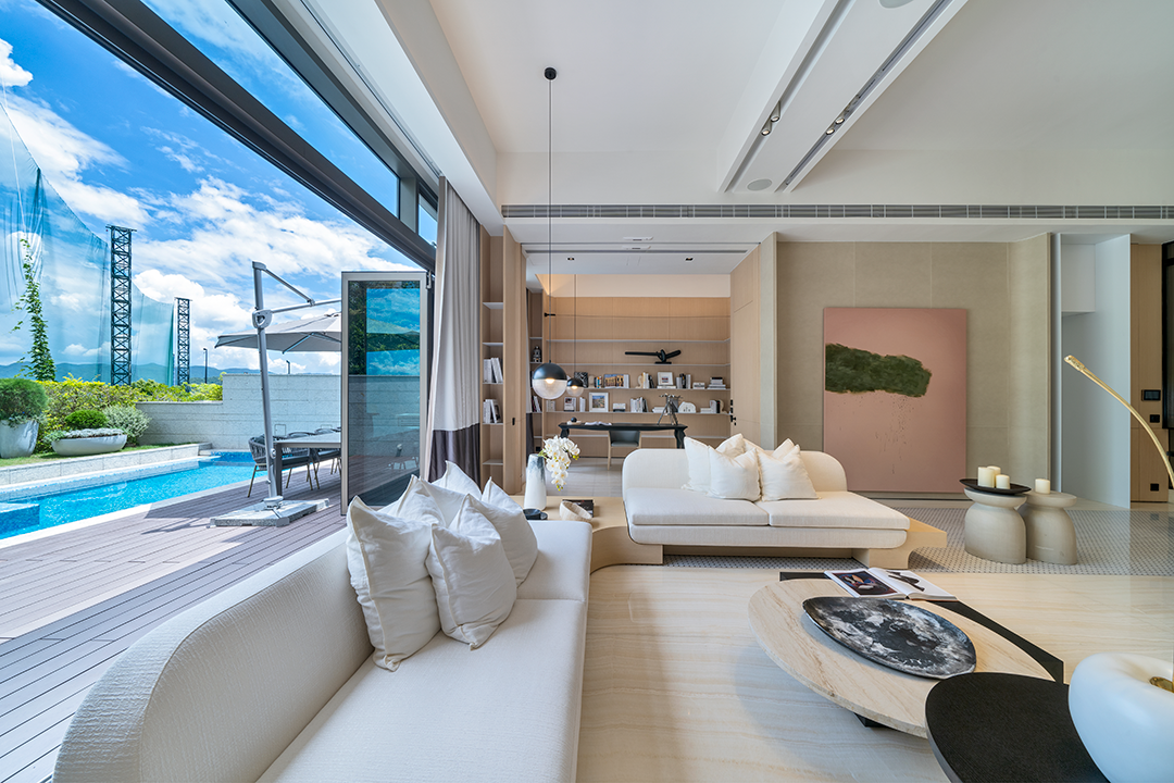 趟折式玻璃幕门连接逾千呎的大花园,私享七米长的泳池,与自然建立起联系与互动,室内外贯通,光影自由穿梭,空间感更加舒坦,花园成为房屋自然的延伸,视线也因此愈加渗透。