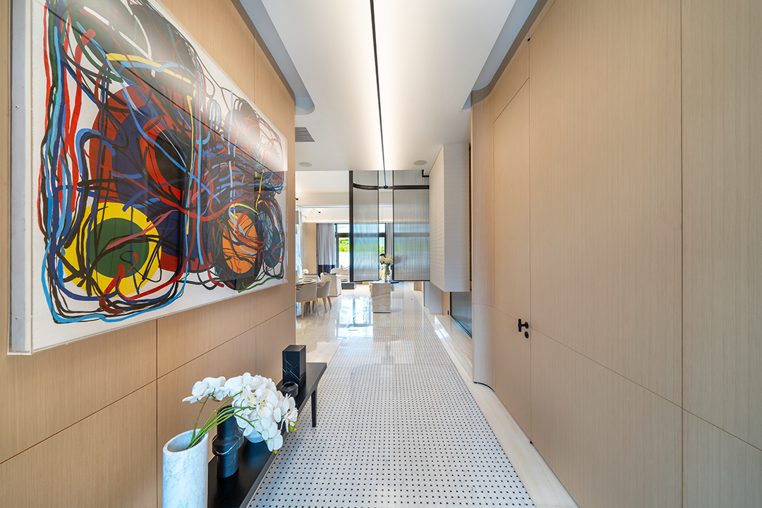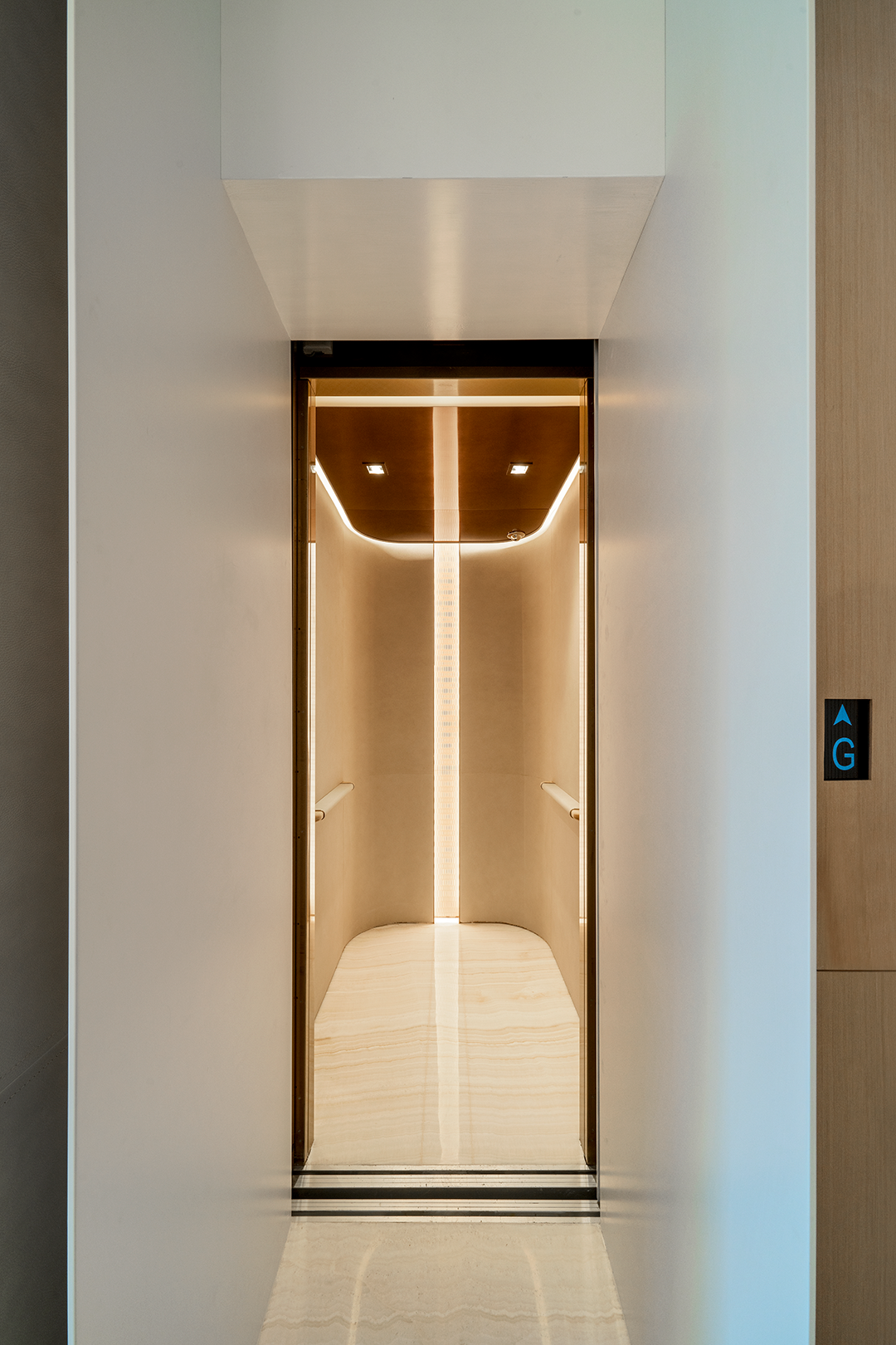 弧形半通透玻璃吊屏风巧妙设置于入口走廊,呼应着空间局部的弧形线条,灵巧无声的光线穿透屏风形成游移。线形装饰灯贯穿于每个空间,既有功能性亦加强空间的线条美与韵律感。