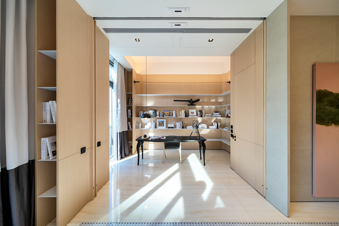 设计师将原本的套房改造为书房,设置电动大趟门可满足不同场景转换。