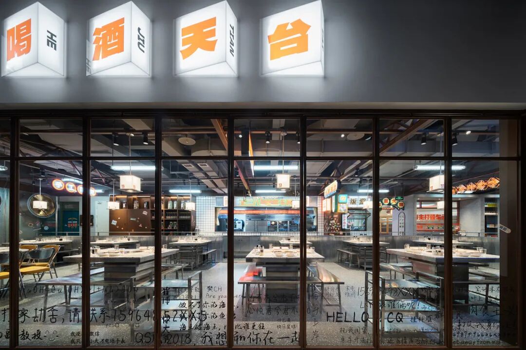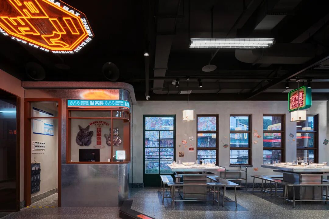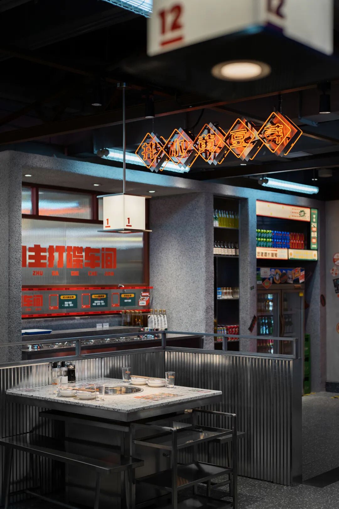 而对于火锅之都的重庆来说,各式各样的风格称出不穷,基于此案的品牌定位“火锅厂”,选择提取出整个空间自己的属性。通过寻找各地中最容易让人理解和引起共鸣的厂文化和精神美学,来开发出属于正二八百的火锅厂。
