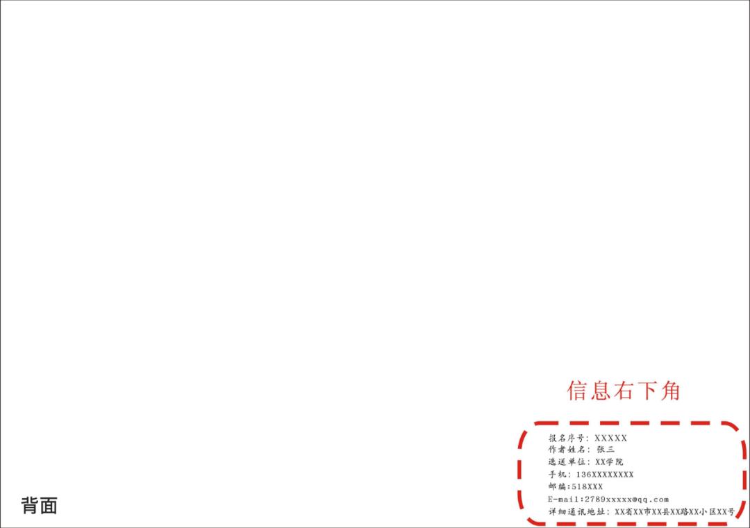 5)在参赛作品背面右下角标明报名序号(线上报名后系统自动生成)、作者姓名、电话、选送单位(必须与《参赛报名表》填写内容一致),要求字迹工整、清晰,如因此引起争议,组委会不承担任何责任。
