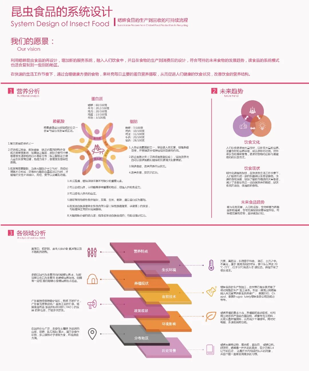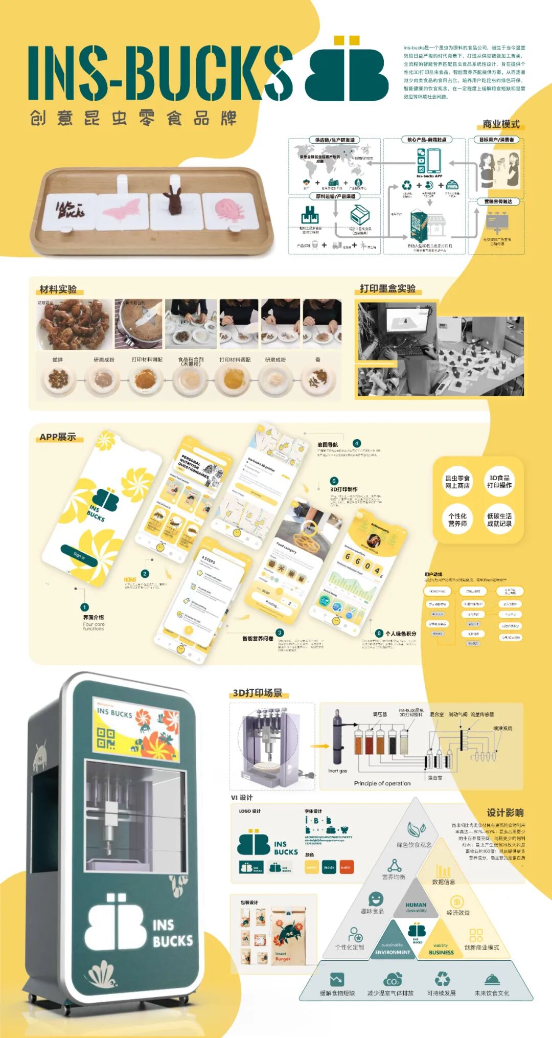 作品简述:项目以昆虫为主要食材,应用3D食品打印技术。旨在面向未来打造低碳智能、千人千面的创意零食服务品牌。