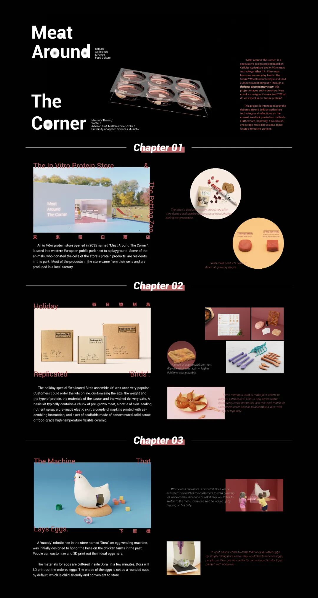 作品简述:[Meat Around The Corner]是一个基于“细胞农业培育人造肉科技”创作的思辨设计项目,以一种科幻的纪录故事形式,想象并描绘了在细胞农业的影响下,可能形成的未来生活方式和饮食文化。本项目旨在引起围绕这项科技的辩论,以及对当下动物农业生产方式的反思。