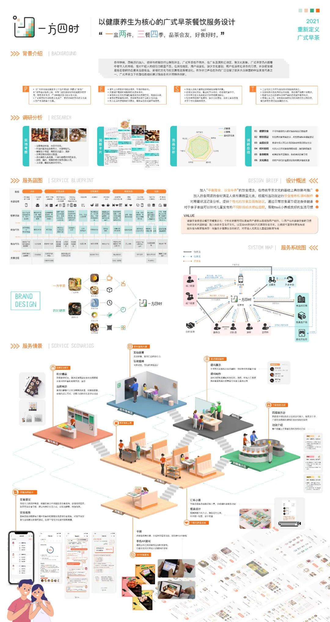作品简述:一方四时,是一个以健康养生为核心的广式早茶餐饮服务系统设计,加入“平衡膳食、以食补养”的饮食理念,在传统早茶文化的基础上进行再创新和推广。