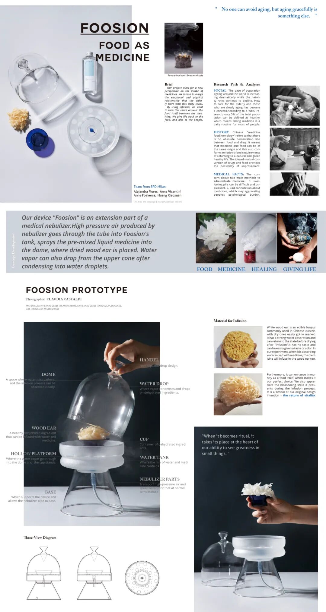 基于社会老龄化的趋势,我们借此作品探索了中国传统的食疗理念和现代药物相结合的可能性;我们认为以食物作为媒介,食愈的仪式化也能对服用药物者的心理产生积极的影响。食物抚慰身心的功效应当贴合当下的社会和发展与时俱进。