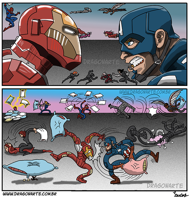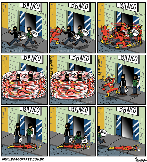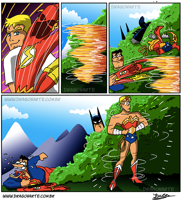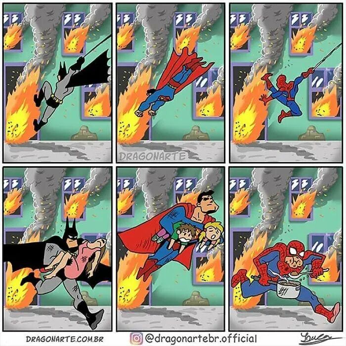 原本不相干的蝙蝠侠和蜘蛛侠,在他的多格漫画中成了好朋友,超人与蝙蝠侠在足球场上比赛,以及许多超级英雄私下的生活场景,每一幅都脑洞大开,让人看完之后感觉十分有趣。