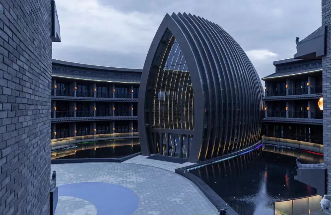 湖州潞村悦柳酒店设计颇具特色,建筑形似蚕茧,置身其中,仿佛进入福建土楼。据了解,酒店在选址、设计、餐饮以及娱乐活动等方面,都充分体现了悦柳品牌主张环保和绿色出行的理念。比如,选址建造初期很大程度地保留周边湿地及自然田园风光,减少对周围植物的破坏;客房设计主打原木色,木饰墙面、原木地板营造出自然感觉。此外,酒店周边的步道可以让客人晨跑、散步或者骑行,鱼塘、稻田及周边的生态农业观光区,可提供“从农场到餐桌”的健康食材。