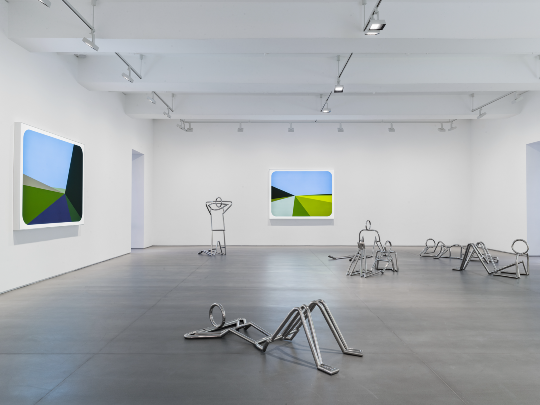 疫情期间,奥培在他家和工作室附近的公园散步,他注意到人们躺卧在草地上野餐、阅读、看手机他们摆出的一系列姿态展示了身体如何与空间和重力产生互动,既填充了环境,也为周围的景观注入活力。他拿出手机假装在发短信,但其实是将周围躺着的人拍摄下来。奥培随后邀请四位模特来到工作室,让他们摆出在公园里看到的姿势。在扫描模特的身体后,他用直线概括地勾勒出形体和姿势。这就成为展览中的一组圆管线形雕塑的灵感之一。这七件不锈钢人体汇聚了艺术家的体验、观察和感知,它们曾经存在于他的记忆里,经过重塑后在南展厅再现。