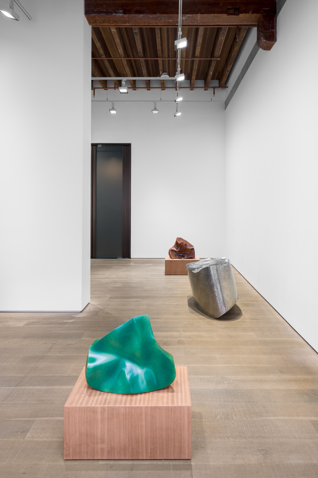 “展出的四件陶瓷作品都是用同一个模具铸造的,但不同的釉面使它们显得不尽相同,它们每件分别特指了一种材料 —— 亮铜、皮革、蓝花岗岩,及翡翠……陶瓷作品的模型是通过使用圆形木棍反复击打一块粘土制成,直到粘土逐渐呈现出我满意的形状为止。然后我仔细测量和放大该模型——这一技术与使用测点仪类似,制作出一件石膏模型并从中形成一个模具,然后结合注浆成型的方式铸造瓷器。”