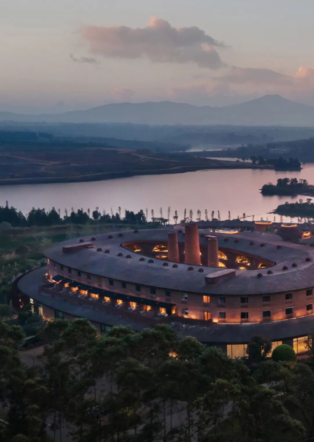 弥勒东风韵酒店隶属精品酒店品牌美憬阁,内设客房 232 间、餐厅 2 间、酒吧 2 间、户外游泳池 1 个以及会议设施若干。室内设计由香港郑中设计事务所负责,以天然建材、哑光配色和柔和照明衬托该建筑的独特造型。“该设计将温暖的氛围和原始的粗矿融入建筑空间,彻底体现了‘艺术对话世界,灵感描绘生活’的美学哲学。”