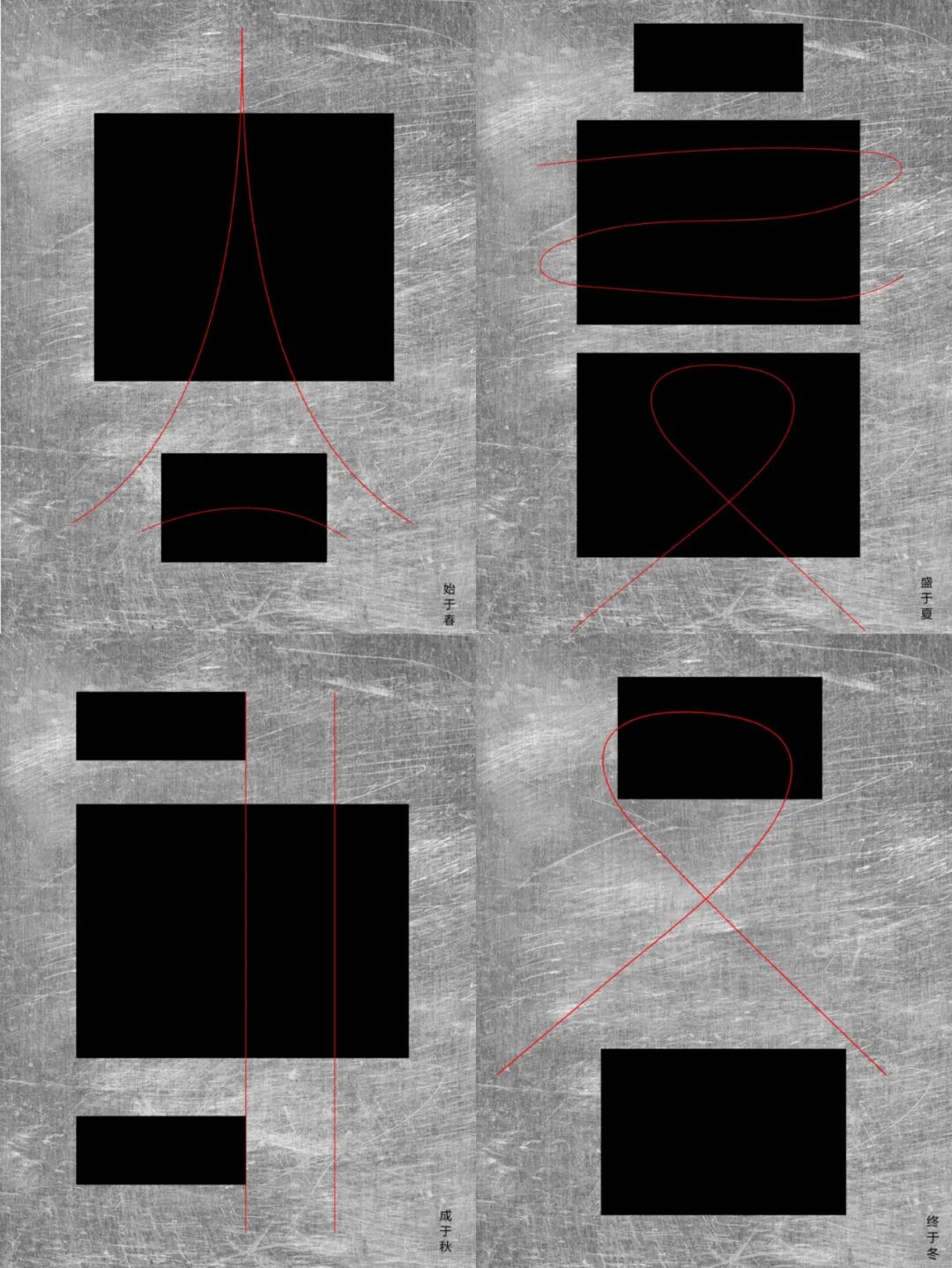 设计说明 | 对春夏秋冬进行极简化处理,画面中大色块加细线的组成了一副极具有美感的效果,打破了原有概念的字体,以一种新的方式表现出来。