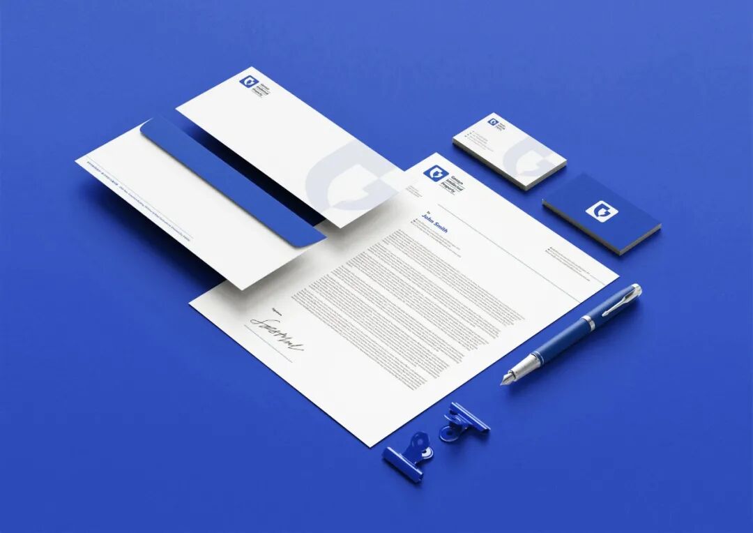 设计说明 | 该标志由企业英文名首字 抽象演变而成, 由一左一右抽象的单引号衔接呼应构成,寓意甲方乙方顺畅的沟通与咨询,标志巧妙运用“正负形”创作手法,利用中空蓝色部分与右侧单引号组成完整立体的盾牌造型,左侧单引号又似一只有力的手紧握盾牌,突出了知识产权保护的行业特征,同时盾牌又似一张笑脸,传递出服务至上的理念。标志以中国传统印章轮廓为外形,采用蔚蓝色象征企业稳健发展的愿景与蓝图。