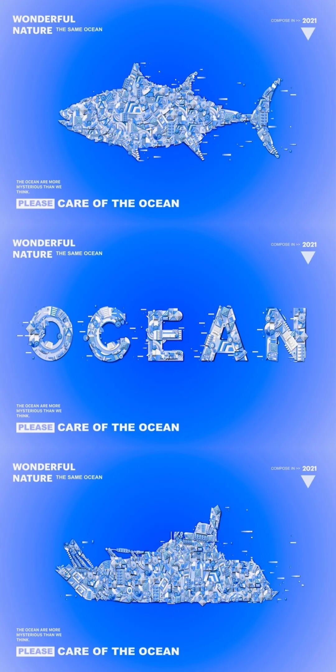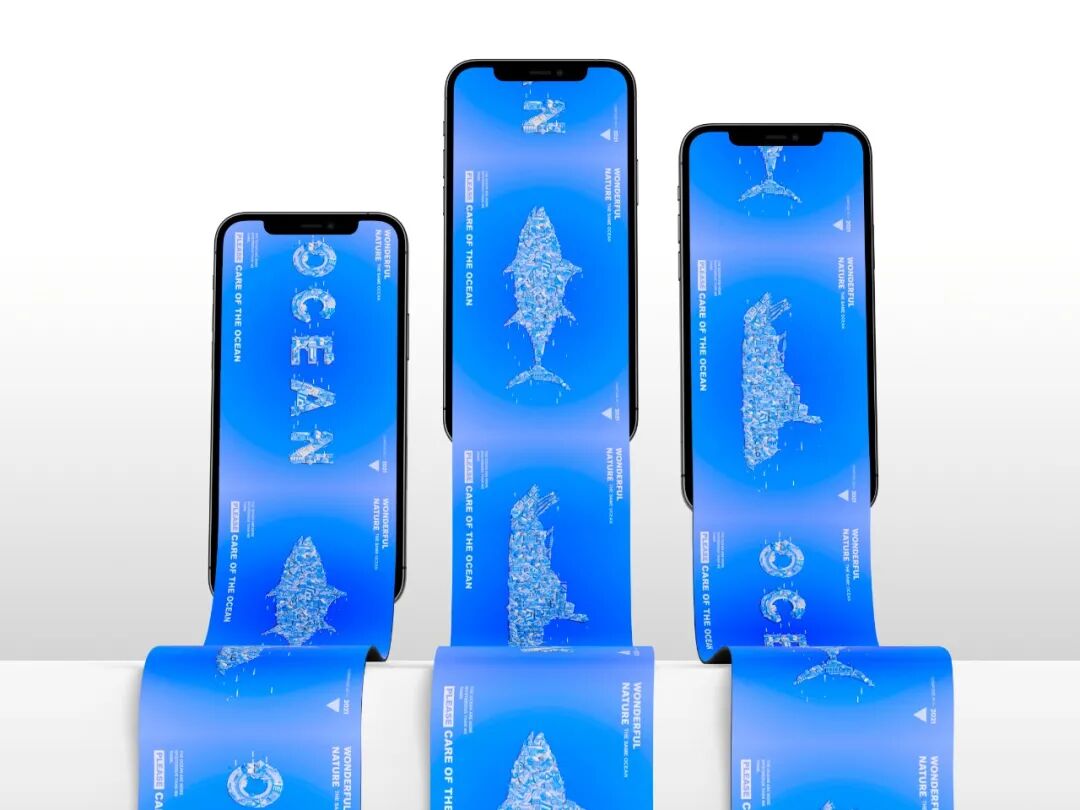 设计说明 | 此海报是作为公益类型的海报,可展示在任意媒介中,路边的广告牌,手机的浏览界面中,杂志书页中,或是随处可见的展示海报架中,在无形中宣传关爱海洋的标语,让人们引起重视和关注经略海洋是当下最热门的话题之一,科技的象征蓝色以及海洋象征的蓝色确定了整套作品系列的主基调带有科技感新锐感和视觉效果.倡导人们需多多关爱海洋的公益主题海报作品。