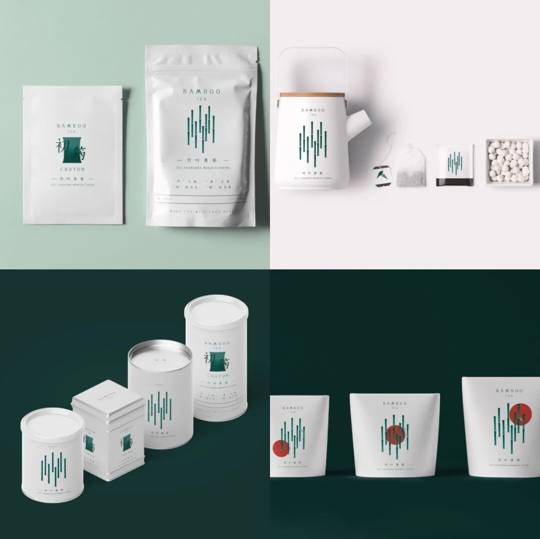 设计说明 | 品牌名为“初筠”,意为初生的竹子的青皮之意思,竹叶茶本身都是采用每年新生的竹叶嫩芽制作而成,竹叶茶是以竹叶为主要原料制作的一种茶。竹为禾本科植物,中空有节、茎、叶常绿,在长江以南各省都有栽种。logo将初筠二字与竹子的简化图形相结合而成。竹子的坚韧不拔,屹立不倒的品质就如同茶师的匠人精神,每一片竹叶都倾注了百分百的心血,也希望可以通过设计表达出这种中国人的风雅与韵味。