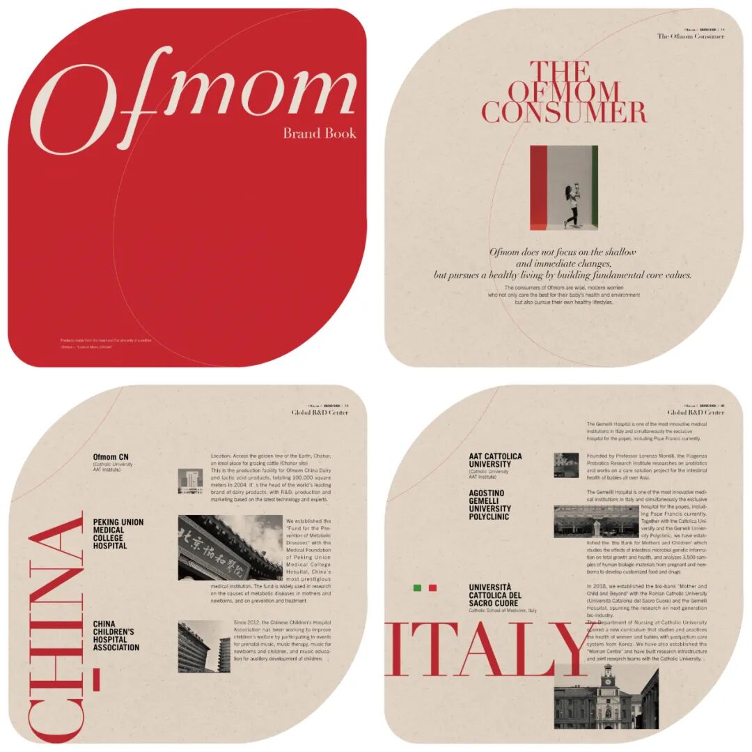设计说明 | 品牌书随着公司历史积淀的速度而发展。这种灵活的方面旨在自由地应用于各种 平台,例如移动和网络,使内容易于访问和下载。此外,我们致力于以可持续的方式采购所有原料,并提高包装的循环经济性。在品牌书的制作过程中,我们通过使用再生环保纸张来保护 土壤健康并以此来表达 Ofmom 对母亲和孩子的哲学。