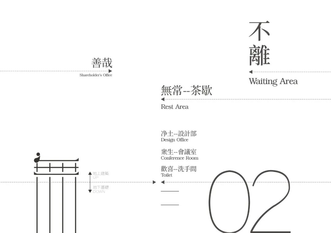 标志图形创作分为上下两部分。下半部为隐没的建筑根基,亦指无界生长的源头精髓;上半部为向上而生的建筑框架,构成主题繁体“无”字,突出建筑设计的行业属性。打坐在建筑上的修禅者,寓意思考下的万物皆空。