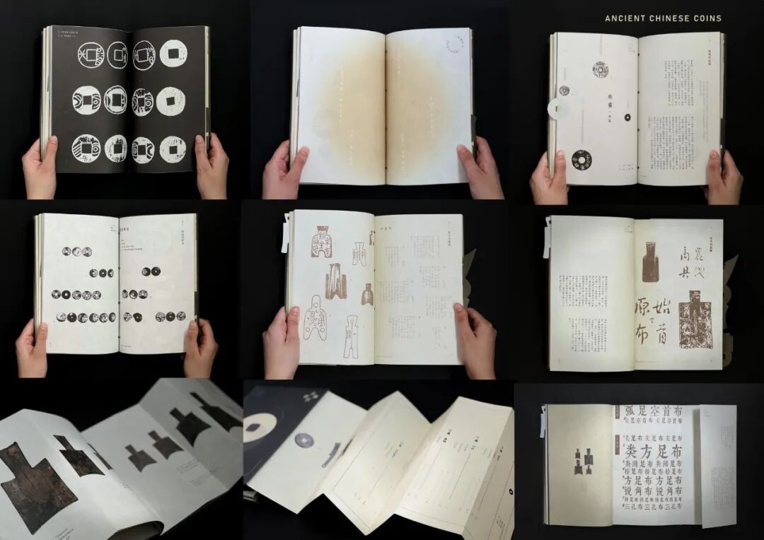 设计说明 |《古代钱币》将历代古代钱币的来源、发展过程、种类串联起来,不同种类的古钱币以时间为叙事逻辑,层层递进,在编辑书籍内容的同时考虑读者阅读的审美需求、功能需求和情感需求,勾勒出古代钱币的基本面貌。《古代钱币》并不是对单一个体的塑造,而是将孤立的各部分有机联系起来,如同一个整体统一的舞台话剧,各元素具有关联性、因果性和层次性,形成一个连续的动态组织系统,呈现出色彩、版式、结构、材质、图像、工艺等相统一、和谐的设计作品。