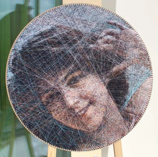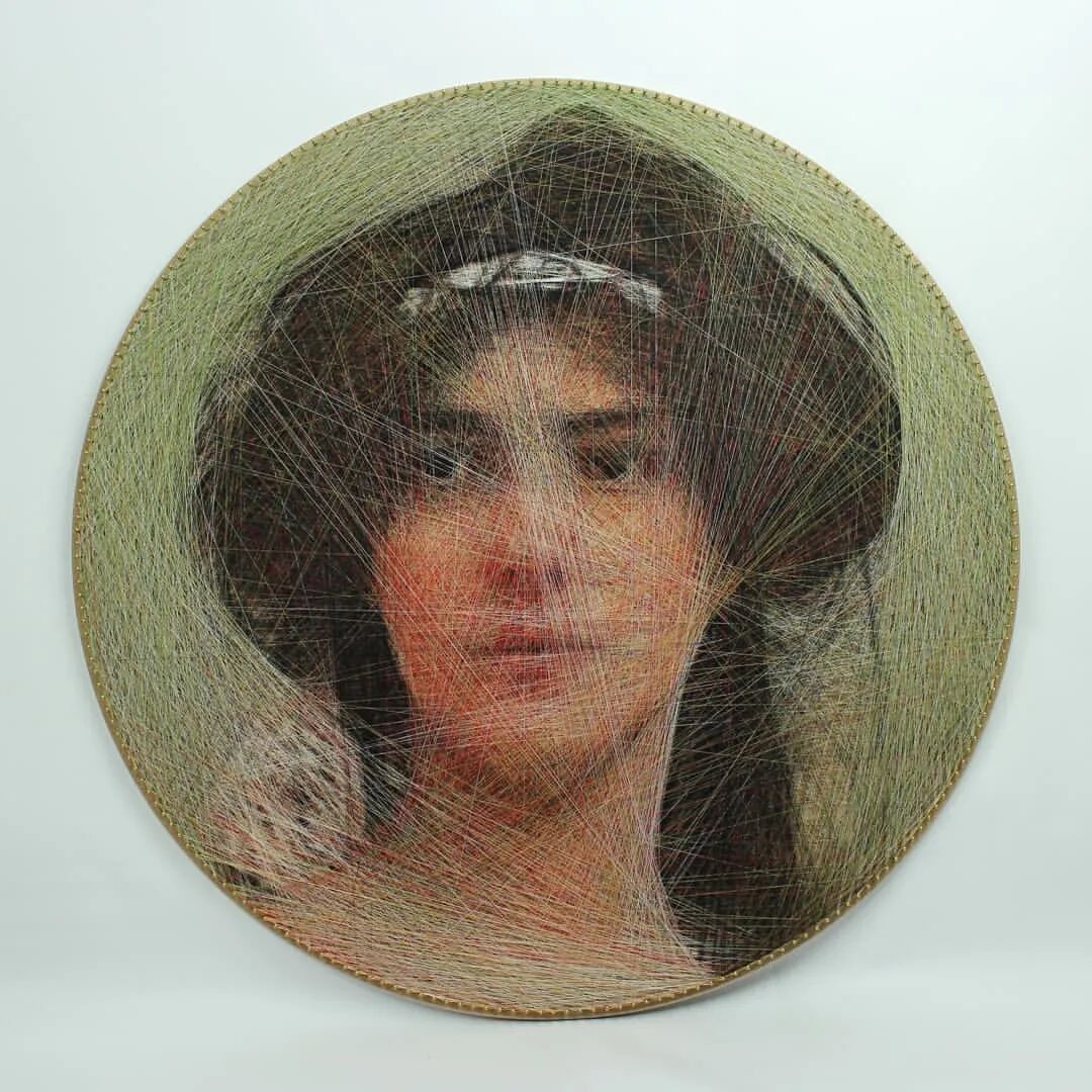 这位出生于1987年的年轻程序员,使用算法生成模式,在这种独特的媒介之下重新创建画作图像,然后在木板的边缘钉上黄铜钉子,接下来使用各种颜色的丝线,相互交错缠绕在钉子上,直到形成逼真的肖像画作。