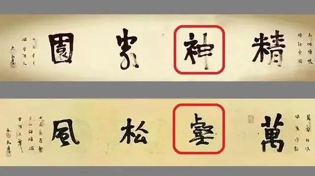 其中最为明显的,恐怕就是两幅四字横幅书法,其中一幅的“精神”二字的“神”被明显多写了一撇,而另外一幅中“壑”字的“土”底写成了“士”底。